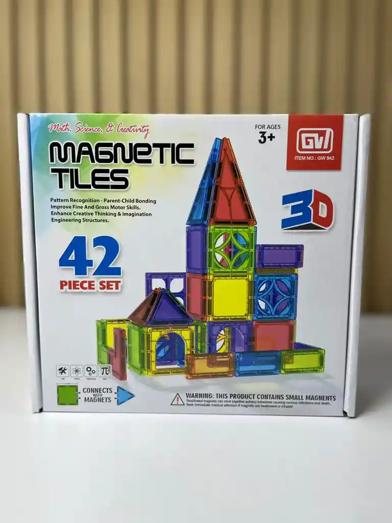 Tipo de juego: Bloques magnéticos de construcción 3D Cantidad de piezas: 42 Edades recomendadas: 3 años en adelante Material: Plástico ABS no tóxico y de alta resistencia, libre de BPA Sistema de unión: Imanes de neodimio encapsulados en los bordes de cada pieza Colores: Translúcidos variados (rojo, azul, verde, amarillo, púrpura, naranja) Formas incluidas (aprox.): Cuadrados Triángulos equiláteros Triángulos isósceles Triángulos rectángulos Piezas especiales con ventanas o puertas Presentación: Caja ilustrada con compartimentos internos para organizar las piezas