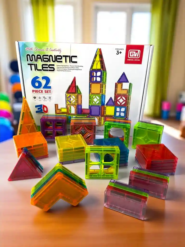 El Juego Magnético 3D de 62 piezas (modelo GW 944) es un set de construcción educativo que utiliza bloques translúcidos con imanes internos para crear figuras geométricas planas y estructuras tridimensionales. Diseñado para niños mayores de 3 años, fomenta el aprendizaje práctico de conceptos de matemáticas, ciencia y arquitectura, al mismo tiempo que estimula la creatividad, la imaginación y la motricidad fina. Especificaciones Tipo de juego: Bloques magnéticos de construcción 3D Cantidad de piezas: 62 Edades recomendadas: 3 años en adelante Material: Plástico ABS de alta resistencia, no tóxico, libre de BPA Sistema de unión: Imanes de neodimio encapsulados en los bordes de cada pieza Colores: Translúcidos variados (rojo, azul, verde, amarillo, púrpura, naranja) Formas incluidas (aprox.): Cuadrados Triángulos equiláteros Triángulos rectángulos Triángulos isósceles Rectángulos Piezas especiales (ventanas, puertas, piezas decorativas) Presentación: Caja ilustrada con separadores internos para organizar las piezas Características Sistema magnético que facilita el ensamblaje y permite construcciones estables. Piezas translúcidas que generan efectos de luz y color atractivos. Compatibles con otros sets magnéticos de la misma línea. Mayor número de piezas respecto a los sets de 34 y 42 piezas, permitiendo diseños más grandes y complejos. Bordes redondeados y superficie lisa para mayor seguridad en niños pequeños.