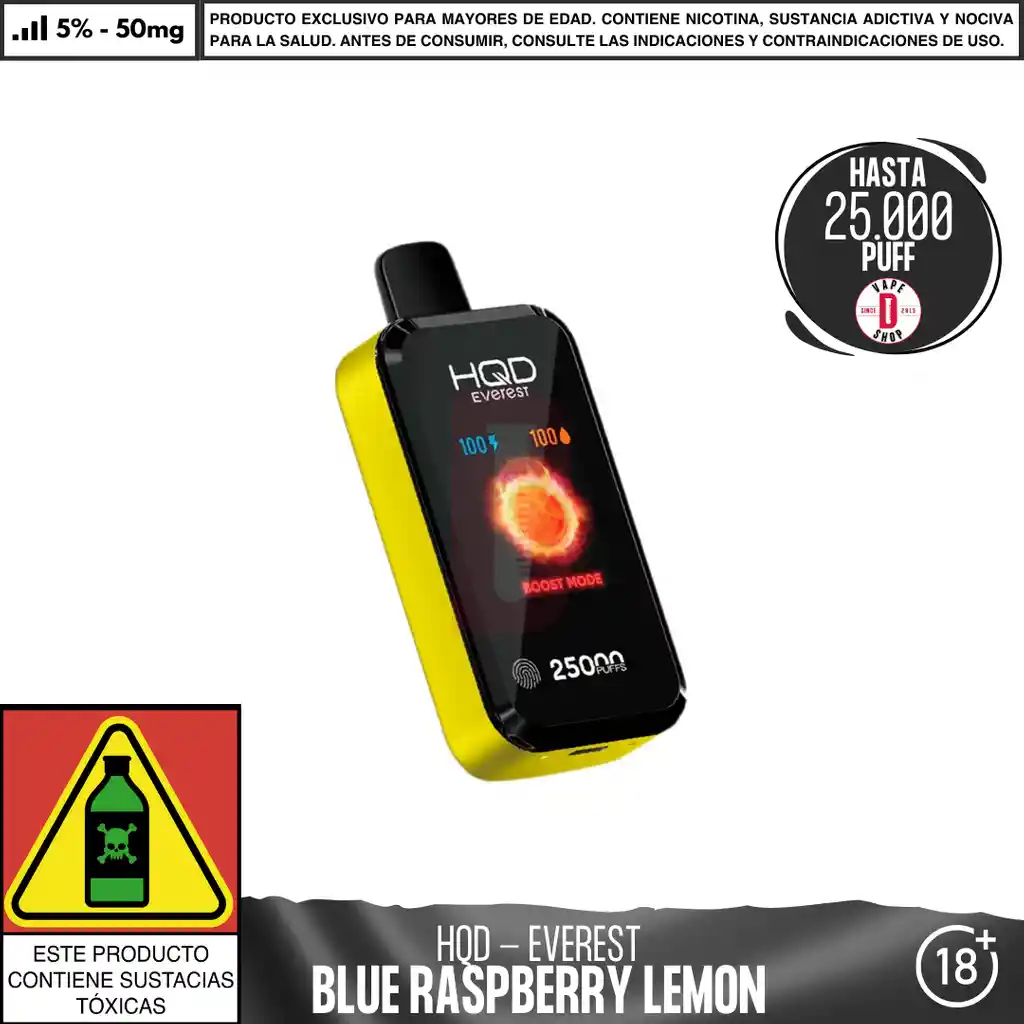 El HQD - Everest es un dispositivo desechable con 25,000 caladas aproximadas, pantalla táctil, 3 niveles de potencia y batería de larga duración. Su diseño moderno y resistencia de doble malla garantizan una experiencia de vapeo satisfactoria. Contenido del paquete: 1 dispositivo desechableConcentración de nicotina: 25000 PUFF - 5% de nicotina salina en peso Características del dispositivo: Dispositivo de vapeo desechable 28 ml de capacidad 1 dispositivo por paquete Batería: 850 mAh (Recargable) Hasta 25000 caladas aproximadamente. 3 modos de potencia : Boost mode - Regular mode - Soft mode. Ingredientes: Glicerina Vegetal, Propilenglicol, Aromatizantes Naturales y Artificiales, Ácido Benzoico, Nicotina. Advertencia: Contiene nicotina, que puede ser venenoso. Evitar el contacto con la piel y los ojos. No ingerir. Mantener siempre en empaque original y en un ambiente fresco y seco. Mantener alejado de niños y mascotas. No debe utilizarse por Mujeres en estado de embarazo o personas con problemas de respiración como el asma. En caso de accidente contacte a la línea 123. PROHIBIDA LA VENTA A MENORES DE 18 AÑOS