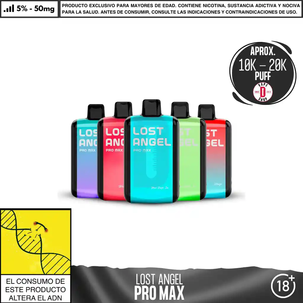 El Lost Angel Vape Pro Max contiene 16 ml de líquido para vapear precargado, una batería recargable integrada, resistencias de malla doble y una pantalla que muestra la duración de la batería, el nivel de líquido para vapear y el estado de carga. *20.000 caladas aproximadamente en modo regular* *10.000 caladas aproximadamente en modo pulso* Características del dispositivo: Dispositivo de vapeo desechable Material: Plástico 16 ml de capacidad 5% de sal nicotina = 50mg / ml 1 dispositivo por paquete Batería: Recargable de 850mAh 20.000 caladas aproximadamente en modo regular 10.000 caladas aproximadamente en modo pulso Puerto de carga USB tipo C Ingredientes: Glicerina Vegetal, Propilenglicol, Aromatizantes Naturales y Artificiales, Ácido Benzoico, Nicotina. Advertencia: Contiene nicotina, que puede ser venenoso. Evitar el contacto con la piel y los ojos. No ingerir. Mantener siempre en empaque original y en un ambiente fresco y seco. Mantener alejado de niños y mascotas. No debe utilizarse por Mujeres en estado de embarazo o personas con problemas de respiración como el asma. En caso de accidente contacte a la línea 123. PROHIBIDA LA VENTA A MENORES DE 18 AÑOS