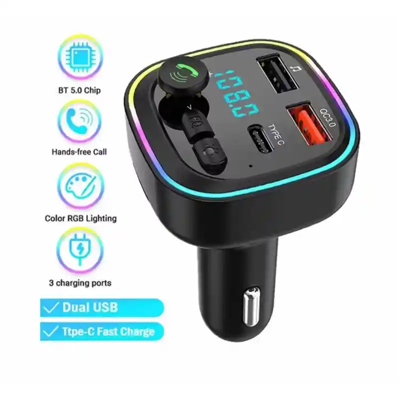 Transmisor FM Bluetooth para coche, QC3.0 y 7 colores con retroiluminación LED, radio para coche, adaptador Bluetooth, reproductor de música, kit de manos libres para coche con ranura para tarjeta SD, compatible con unidad flash USB - NX10 (negro) Nulaxy Bluetooth FM Transmitter for Car, QC3.0 7 Colors LED Backlit Car Radio Bluetooth Adapter Music Player Hands Free Car Kit with SD Card Slot, Supports USB Flash Drive - NX10 (Black) Marca: Nulaxy Dimensiones: 7.35 x 3.15 x 2.3 Pulgadas Carga rápida 3.0: posiblemente la última tecnología de carga USB más rápida y eficiente del mundo. Hasta 4 veces más rápido que los cargadores estándar, es capaz de cargar dispositivos compatibles al 80% en 35 minutos. Transmisión de música nítida: puedes transmitir música en el estéreo de tu coche a través de Bluetooth/USB Flash Drive ( menor o igual a 32GB) / tarjeta microSD ( menor o igual a 32GB). Tecnología avanzada de reducción de ruido que garantiza la calidad, sonido nítido. Nota: WMA MP3 WAV APE FLAC formatos de música en unidad flash USB o tarjeta microSD son compatibles. Disfruta de llamadas con manos libres: la tecnología Nulaxy proporciona una conexión estable y la cancelación de eco puede reducir el ruido de fondo para una mejor llamada manos libres, así que puedes responder llamadas de teléfono pulsando el botón. Versión de retroiluminación LED de 7 colores: compatible con 7 colores de luz LED retroiluminada, incluyendo rojo/verde/azul/verde amarillento/púrpura/cian, este transmisor FM Bluetooth te dará una visualización visualmente impresionante de colores, que es una buena manera de que coincida con los colores ya en el coche. Funciones de seguridad: la seguridad es lo primero. NX10 está equipado con un voltímetro para mostrar el estado de la batería de tu coche. El voltaje debe estar entre 13. 2 V a 14. 7 V cuando tu coche está encendido y en movimiento. 12. 2 V a 12. 8 V cuando tu coche está estacionado y el encendido está apagado. IC:26752-NX10. HVIN: NX10