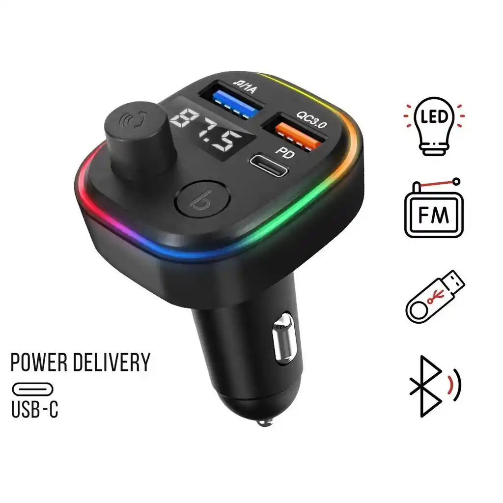Puntos fuertes *Transmisor FM Bluetooth modelo C2, un auténtico compañero de viaje *Transmite música desde tu dispositivo a través de Bluetooth a la radio del vehículo *Equipado con una entrada USB para conectar tu llave USB *Puerto USB C Power Delivery carga rápida y eficiente de tus dispositivos. *También incluye un puerto USB Quick Charge 3.0 para carga rápida *Retroiluminación LED con varios colores a elegir *Cómodos botones para cambiar la frecuencia y el color del LED *Compatible con cualquier vehículo con puerto para encendedor de cigarrillos Disfruta de tu música mientras conduces con este transmisor FM Bluetooth, modelo C2. Cuenta con tecnología Bluetooth y una entrada para llave USB. También dispone de un puerto USB-C y un puerto USB para cargar tus dispositivos mientras te desplazas.