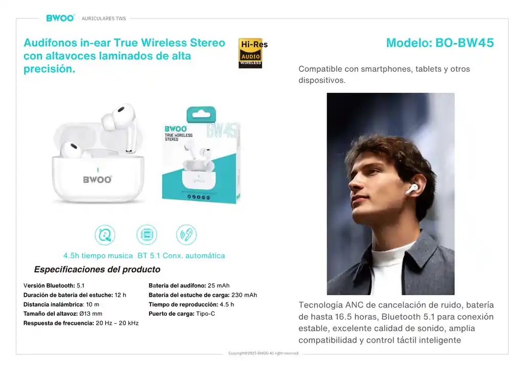 Bluetooth : 5.1 Duracion de bateria : 12H Distancia inalambrica : 10MTS Respuesta de frecuencia _ 20Hz-20kHz