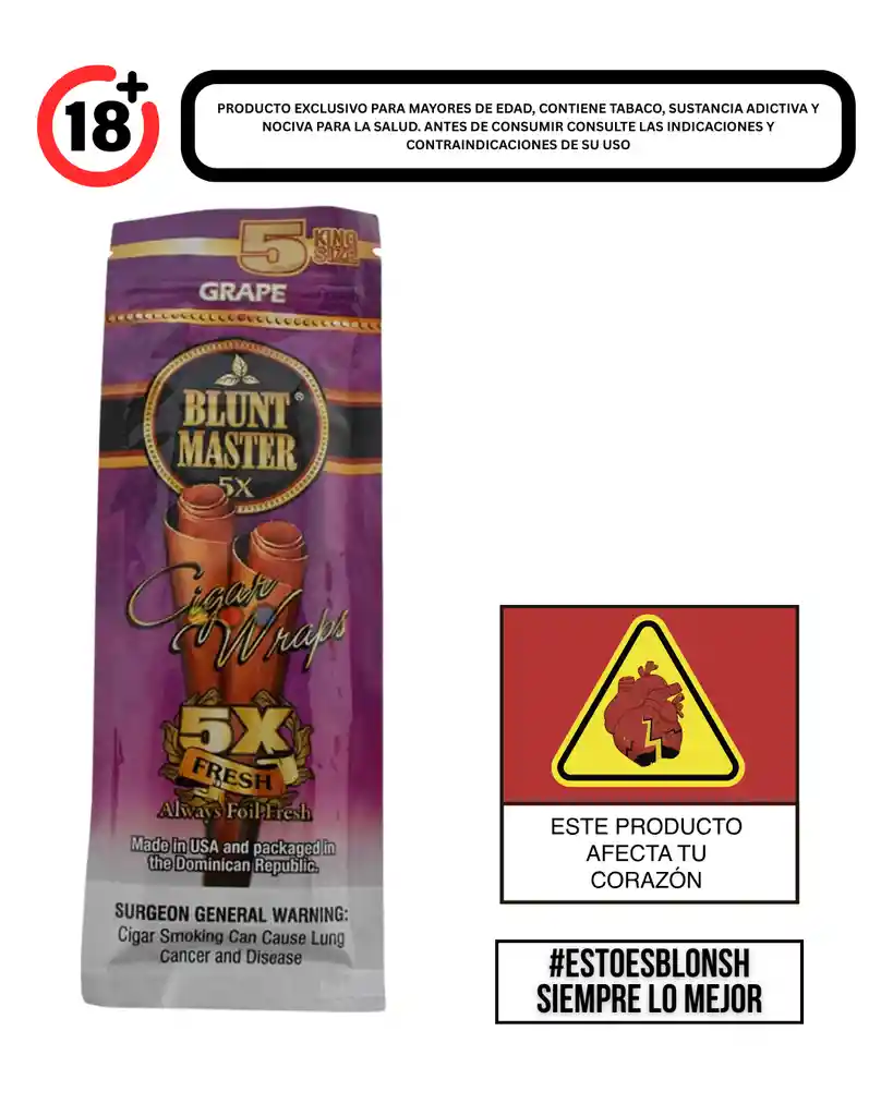 Es un envoltorio de papel laminado que contiene 5 papeles de tabaco, enrollados en forma de espiral, similar a los papeles de fumar, pero estos son más resistentes, con una combustión más lenta, uniforme y aromática, permitiendo una fusión perfecta entre tu tabaco favorito, combinado con el delicioso sabor exótico de tu elección, logrando hacer tu experiencia inigualable. por esto y mas los BLUNT MASTER uno de los papeles de blunt mas finos y deliciosos del mercado. Este producto puede ser utilizado para productos que contienen nicotina o tabaco. El tabaco y la nicotina son nocivos para la salud. Ley 30 de 1986. Verificar condiciones de uso, indicaciones y contraindicaciones en la etiqueta. Prohibida la venta a menores de edad