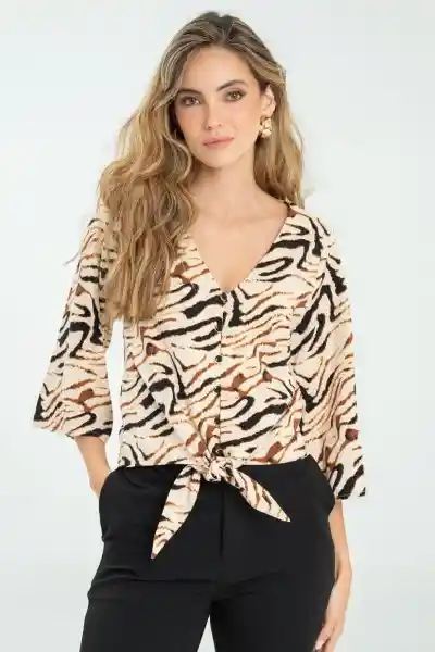 En Tejido Plano Estampado Manga 3/4 Con un Poco de Vuelo Botonado al Beso Con Falso Ojales en Tela y Botón de Pata 18L Tiras Dobles Que Anudan en Centro Frente Ruedo Espalda Lisa Silueta Semi Ajustada.