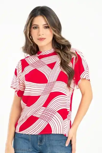 En Tejido Plano Estampado Cuello Redondo Con Ruche en la Misma Tela Abertura en la Parte Superior Trasera Botón de Pata 18L Manga Corta Con un Poco de Vuelo Aberturas de 5 cms a Lado y Lado Del Ruedo Ruedo de 0.8 mm Silueta Semi - Ajustada.