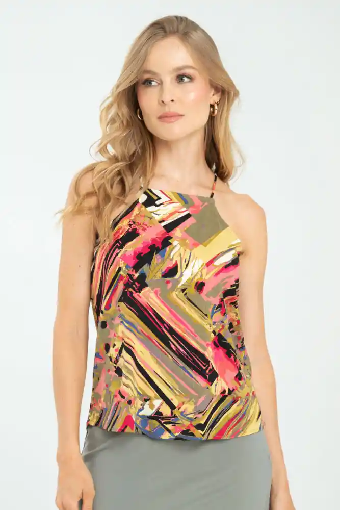 Blusa en tejido plano estampado, escote halter, tiras pitillo en la misma tela, abertura con ojal en tela y botón de pata, ruedo de 1cms, silueta semi ajustada.