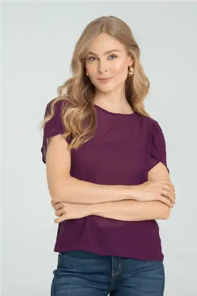 En Chifón Crepe Cuello Sesgado Redondo Manga Corta Pétalo Sobrepuesta.