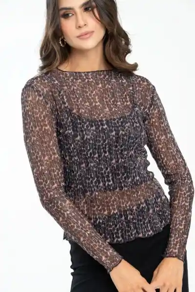 En Mesh Con Lurex Animal Print Escote Alto Redondo Manga Larga.