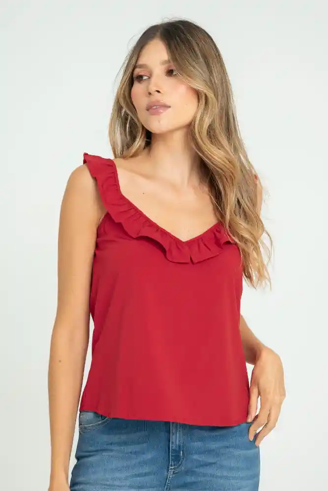 Blusa en chalis fondo entero, escote en V con bolero decorativo, manga sisa, silueta semi ajustada.