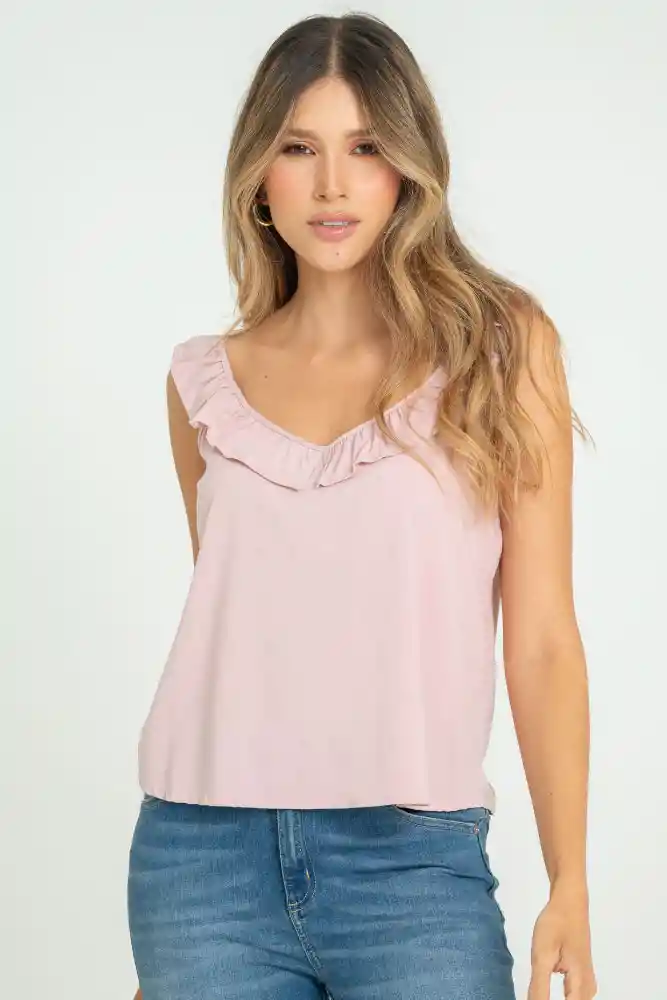 Blusa en chalis fondo entero, escote en V con bolero decorativo, manga sisa, silueta semi ajustada.