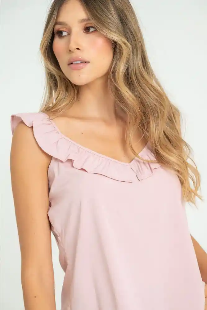 Blusa en chalis fondo entero, escote en V con bolero decorativo, manga sisa, silueta semi ajustada.