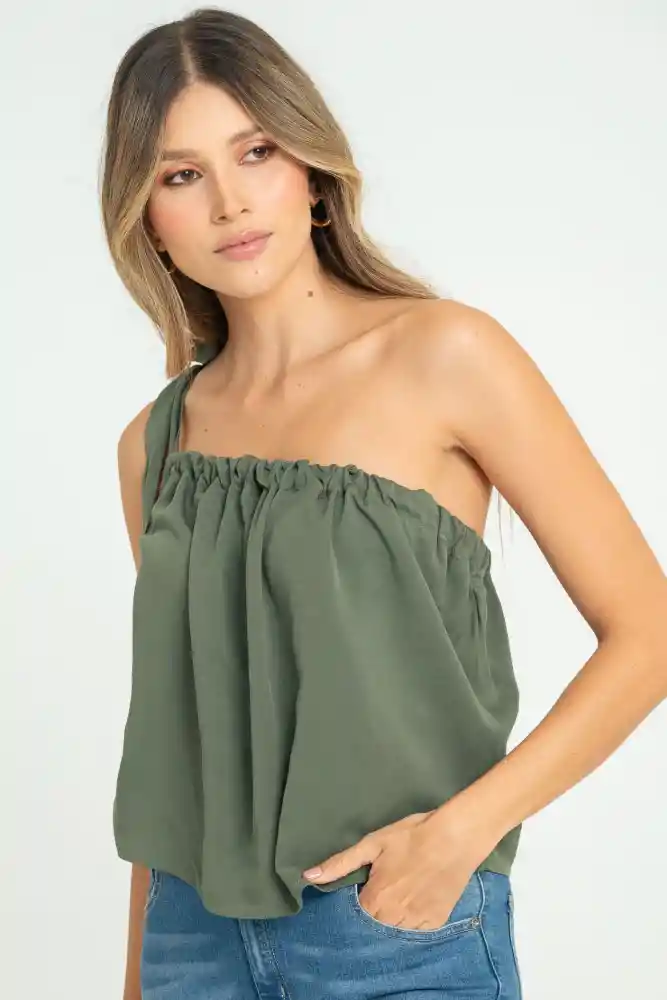 Blusa en chalis fondo entero, amarre en hombro, silueta amplia.