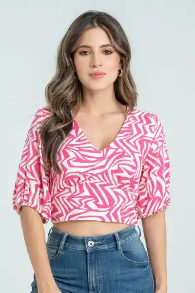 En Tejido Plano Estampado Escote en V Con Falso en Delantero Manga Corta Con Elastico de 1 cm en Puño Cierre Semi Invisible T/T en Costado Izquierdo Fajon en la Parte Delantera Silueta Semi Ajustada.