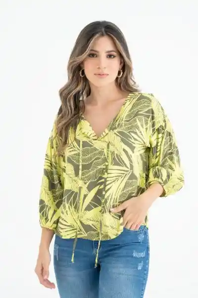En Chalís Estampado Cuello en V Con Amarre Manga 3/4 Con Volumen y Recogido.