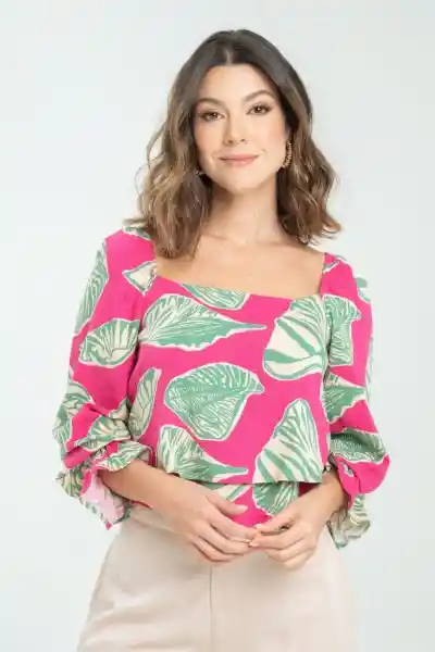 En Tejido Plano Estampado Elástico de 1 cm en Hombro Manga Larga Con Puño Enresortado en Nido de Abeja Con Campanita en Ruedo Cuerpo en Doble Capa Silueta Semi Ajustada.