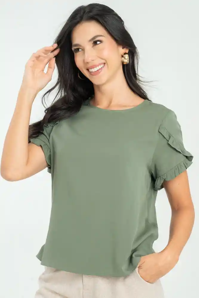 Blusa en tejido plano fondo entero, cuello redondo con sesgo de 1cms asentado en la parte interna, abertura con ojal en tela y botón de pata 18L, manga corta con detalle de bolero en ruedo, aberturas de 5cms a lado y lado del ruedo, ruedo de 0.8cms.