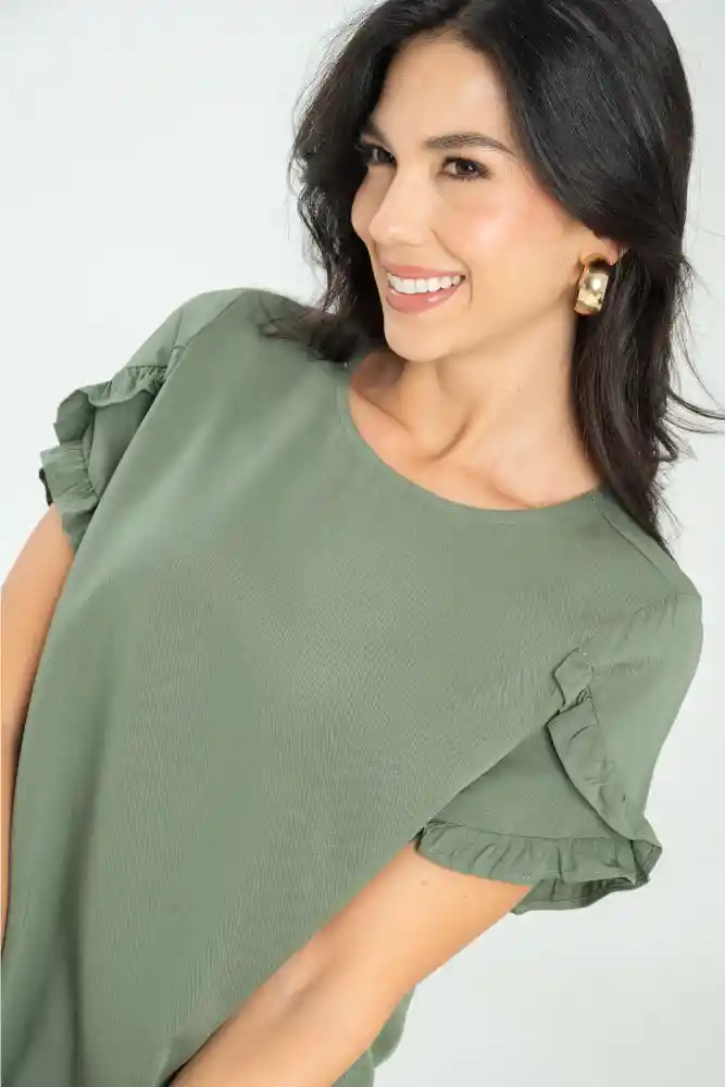 Blusa en tejido plano fondo entero, cuello redondo con sesgo de 1cms asentado en la parte interna, abertura con ojal en tela y botón de pata 18L, manga corta con detalle de bolero en ruedo, aberturas de 5cms a lado y lado del ruedo, ruedo de 0.8cms.