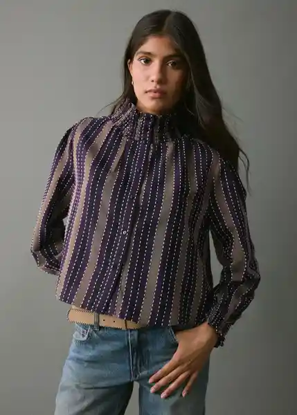 Cierre Delantero Con Botones Cuello Alto Detalle Fruncido en el Cuello Diseño Bordado Diseño de Rayas Diseño Recto Manga Larga Con Puños Elásticos y Fruncidos Tejido de Algodón Tejido Poliéster - 17047124_65.