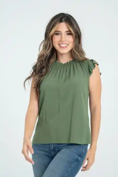 En Tejido Plano Fondo Entero Cuello en Elastico de 1 cm Con Rouche en la Misma Tela Boton de Pata 18L T/T en la Parte Trasera Del Cuello Manga Corta Con un Poco de Vuelo Silueta Semi Ajustada.