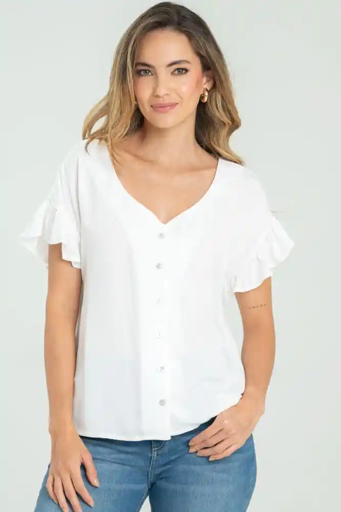 Blusa en chalis fondo entero, escote en V, perilla con botones de 18L tipo nacar, sisa rodada con bolero, espalda lisa, silueta amplia.