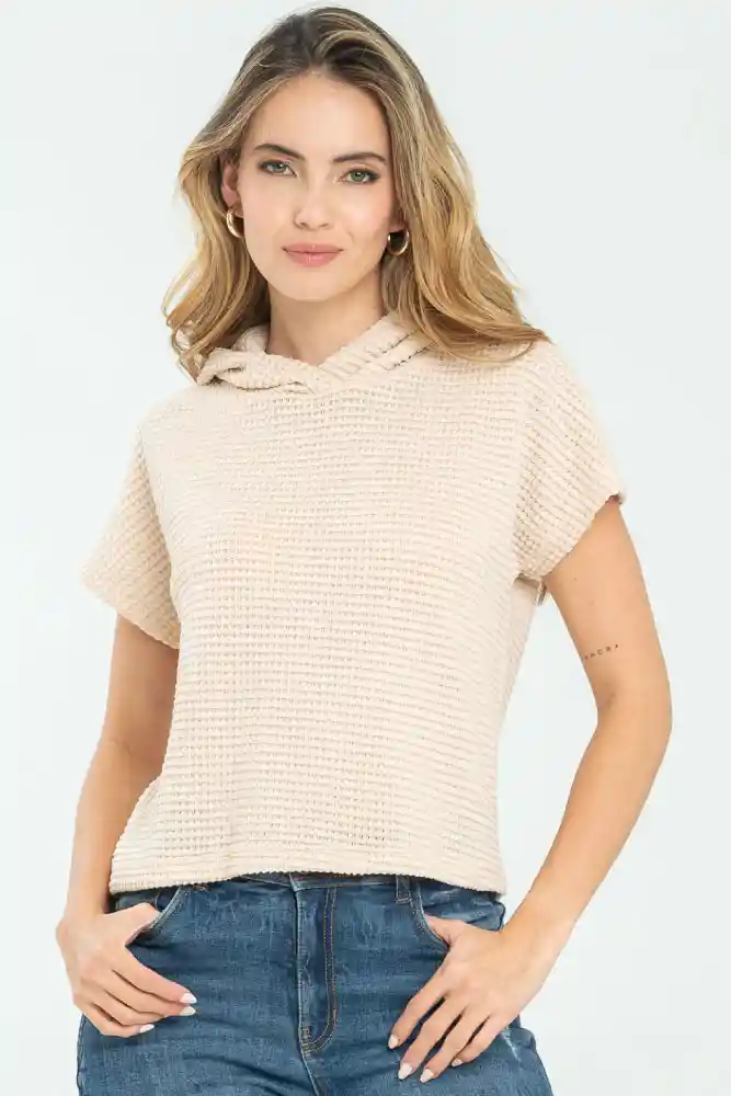Blusa tejida con capucha, manga rodada, silueta amplia.