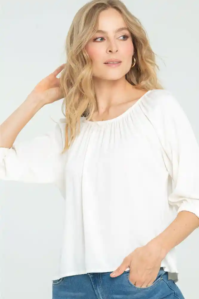 Blusa en chalis fondo entero, escote redondo con elástico y recogido, manga 3/4 con elástico en ruedo del puño.
