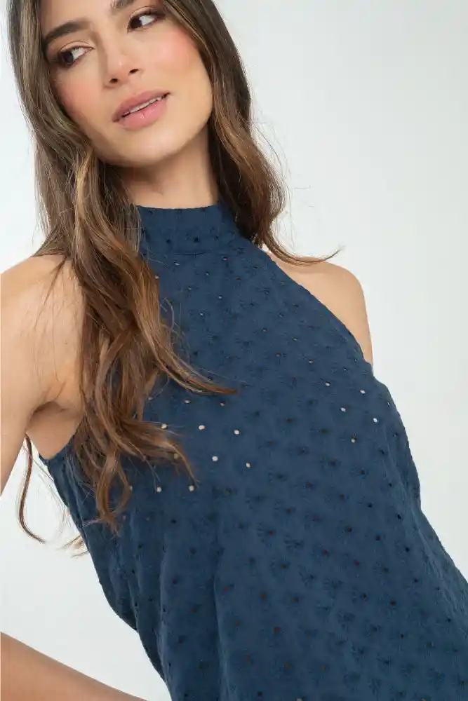 Blusa en tejido plano tipo ojalillo, cuello alto que botona en la parte trasera del cuello, con botones de pata 16L, escote de la sisa en halter, abertura y corte en centro espalda, silueta semi ajustada.