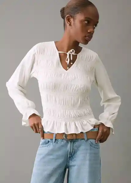 Bajo Con Volante Cuello Pico Cuerpo Fruncido Diseño Recto Lazo Decorativo Manga Larga Con Puños Elásticos y Fruncidos Tejido de Viscosa Tejido Fluido - 27091220_02.