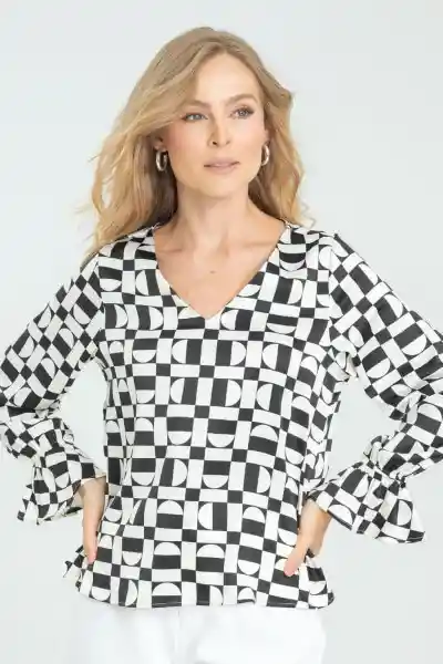 En Tejido Plano Tipo Satín Estampado Escote en V Con Sesgo Asentado en la Parte Interna Manga Larga Con Elástico de 1 cm en Puño y Campanita en Ruedo Aberturas de 6 cms a Lado y Lado Del Ruedo Silueta Semi Ajustada.