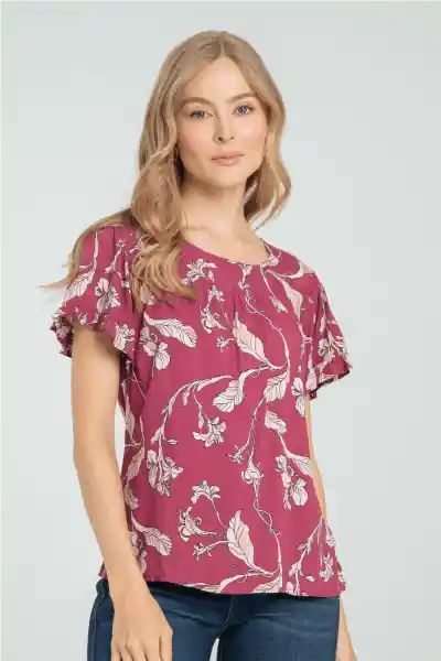 En Chalis Estampado Escote Redondo Con Abertura en Espalda y Botón Manga Corta Con Bolero Detalle de Corte Con Recogido en Frente Superior.