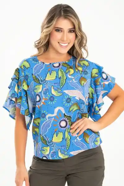 En Tejido Plano Estampado Escote Redondo Con Sesgo de 1 cm Abertura Con Botón de Pata 18L y Ojal en Tela Sisa Rodada Doble Manga Corta Sin Recogido Ruedo de 0.5 mm Silueta Semi - Ajustada.