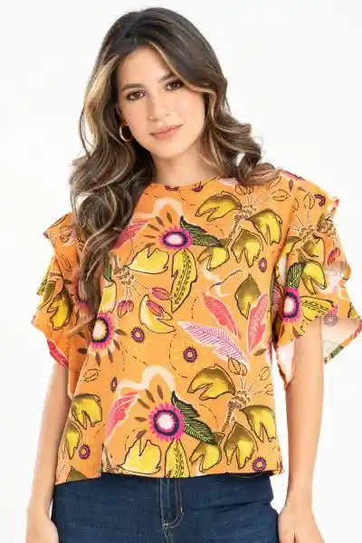En Tejido Plano Estampado Escote Redondo Con Sesgo de 1 cm Abertura Con Botón de Pata 18L y Ojal en Tela Sisa Rodada Doble Manga Corta Sin Recogido Ruedo de 0.5 mm Silueta Semi - Ajustada.