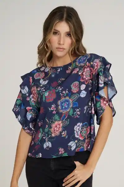 En Crepe Estampado Escote Redondo Con Abertura en Espalda 2 Volante en Manga.