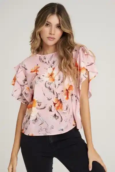 En Crepe Estampado Escote Redondo Con Abertura en Espalda 2 Volante en Manga.