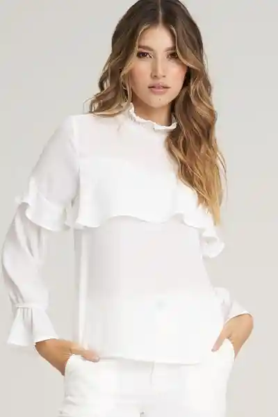 En Chifón Fondo Entero Cuello Resortado Redondo Con Abertura en Espalda y Botón Manga Larga Con Bolero en Puño Detalle de Bolero en Mangas y Frente Superior.