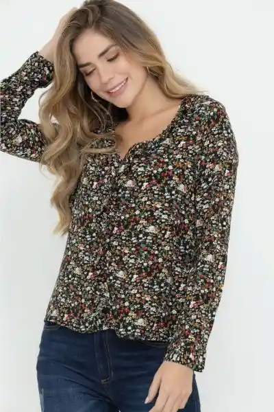 Chalís Estampado Escote en V Con Boleros Decorativos Manga Larga Con Puño y Botón Metálico Silueta Amplia.