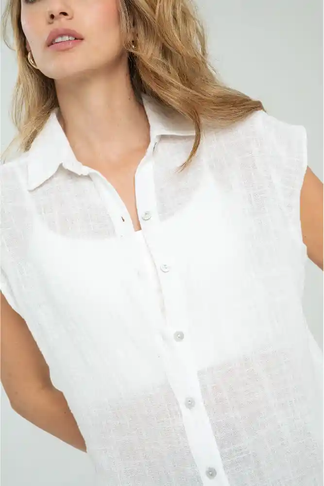 Camisa en tejido plano con textura en fondo entero, cuello camisero, perilla en centro frente con botones de 18L, manga corta que muere en la sisa, aberturas de 6cms en los laterales a lado y lado del ruedo, ruedo de 0.8cms, silueta semi ajustada.