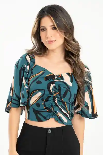 En Chalis Estampado Escote en V Con Recogido en Centro Frente Manga Corta Campana Con Abertura Silueta Ajustada Con Cierre Lateral.