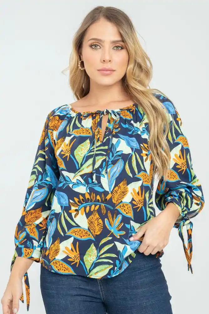 Blusa en tejido plano estampado, escote redondo sesgado, manga 3/4 con abertura sesgada, puño doble de 3cm que termina en tiras para anudar, aberturas de 6cm a lado y lado del ruedo, ruedo de 0.8MM, sileuta semi ajustada.
