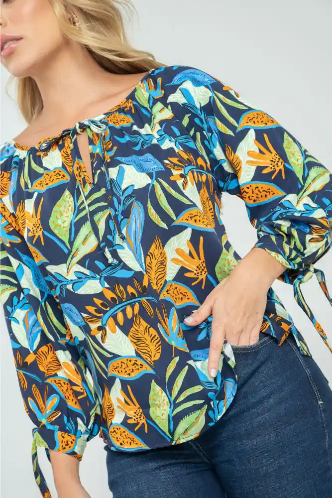Blusa en tejido plano estampado, escote redondo sesgado, manga 3/4 con abertura sesgada, puño doble de 3cm que termina en tiras para anudar, aberturas de 6cm a lado y lado del ruedo, ruedo de 0.8MM, sileuta semi ajustada.