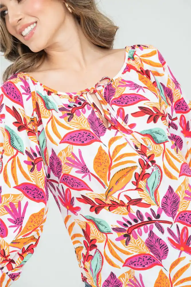 Blusa en tejido plano estampado, escote redondo sesgado, manga 3/4 con abertura sesgada, puño doble de 3cm que termina en tiras para anudar, aberturas de 6cm a lado y lado del ruedo, ruedo de 0.8MM, sileuta semi ajustada.