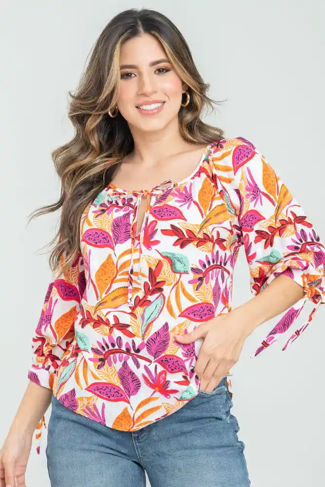 Blusa en tejido plano estampado, escote redondo sesgado, manga 3/4 con abertura sesgada, puño doble de 3cm que termina en tiras para anudar, aberturas de 6cm a lado y lado del ruedo, ruedo de 0.8MM, sileuta semi ajustada.