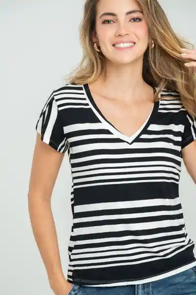 En Tejido de Punto de Rayas Escote en V en la Parte Delantera Manga Corta Sobrepuesta en la Parte Delantera Silueta Semi Ajustada.