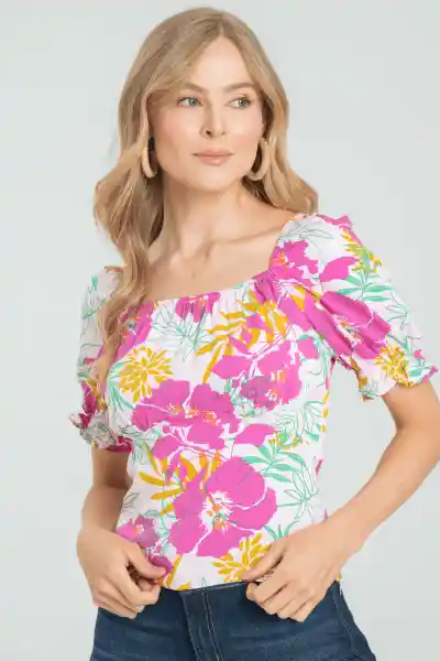 En Chalís Estampado Escote Redondo Con Elástico Manga Corta Puffy Silueta Ajustada.