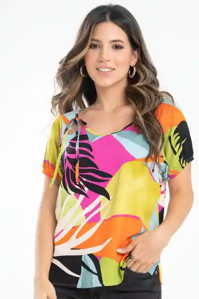 En Tejido Plano Estampado Cuello Redondo Con Sesgo de 1 cm Sisa en Diagonal Con Aberturas Que Anudan Con Sesgos a Lado y Lado Del Escote Manga Corta Con Elástico en Puño de 1 cm Aberturas de 5 cm a Lado y Lado Del Ruedo Silueta Semi Ajustada.
