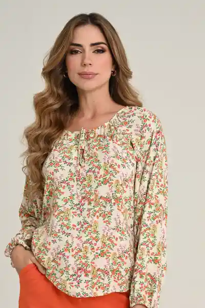 En Chalis Estampado Escote Sesgado Redondo Con Abertura Frontal y Tira Para Anudado Manga Larga Con Elástico en Ruedo.