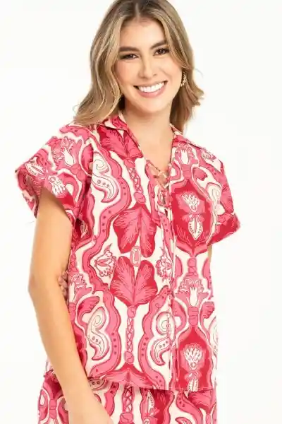 En Popelina Estampada Cuello Camisero Con Escote en V y Tira Sesgo Cruzado Para Anudado Manga Corta Rodada Con Guardapolvo.