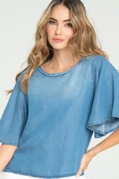 En Denim Liviano Fondo Entero Cuello Redondo Con Abertura en Espalda y Botón Manga Corta Tipo Campana.