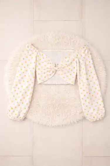 Blusa manga larga tipo top color crema con estampada. Talla unica